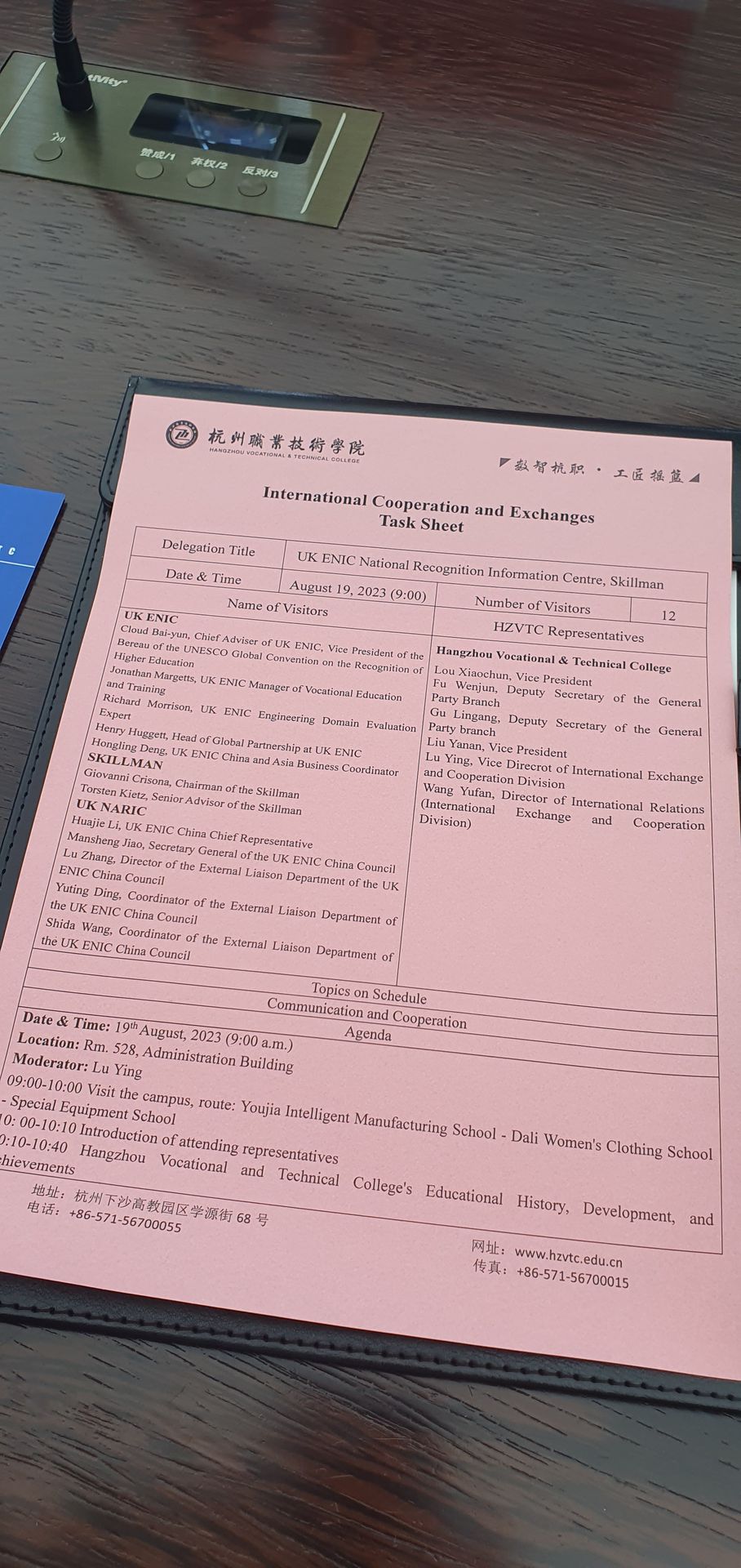On August 19, 2023, Giovanni Crisona, Chairman of Skillman, and Torsten Kietz, Senior Advisor of Skillman, together with Cloud Bayun, Chief Advisor of UK ENIC, and other members of an European delegation, met with Lou Xiaochun, Vice President of Hangzhou Vocational & Technical College, Fu Wenjun, Deputy Secretary of the General Party Branch, Gu Lingang, Deputy Secretary of the General Party branch, Liu Yanan, Vice President, Lu Ying, Vice Director of International Exchange and Cooperation Division, and Wang Yufan, Director of International Relations (International Exchange and Cooperation Division), to discuss potential collaboration focusing, in particular, the opportunities offered by Tracks4Crafts.eu initiative.